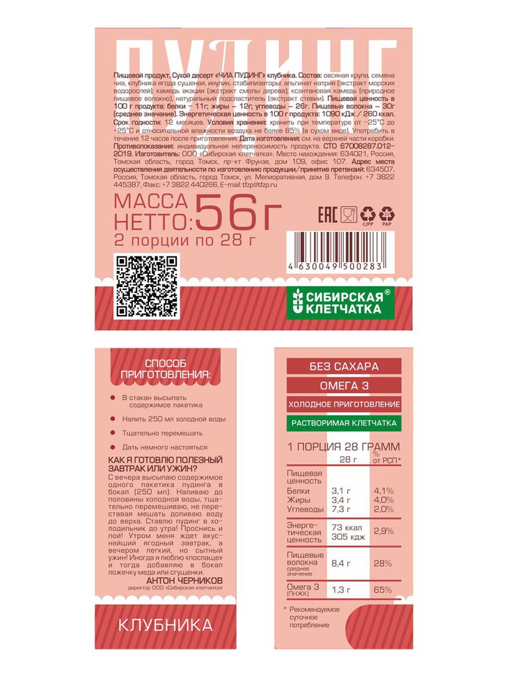 Клубничный чиа пудинг. В чем его особенность? Вкусный, полезный, натуральный и необычайно простой в приготовлении. Отличное решение для перекуса, завтрака, ужина и праздничного угощения. Чиа пудинг утоляет голод на 4-6 часов при калорийности порции 73 ккал! Чиа пудинг готовится очень просто! Содержимое пакета тщательно размешивается в воде, кисломолочных напитках, или растительном молоке. Для более сладкого вкуса добавляется мед, сироп и т.д. Настаивается до загустения 5 минут и подается на стол. При более длительном настаивании в холодильнике пудинг густеет еще больше. Загустевший пудинг при вторичном перемешивании теряет густоту. Чиа пудинг не содержит сахара, подсластителей и консервантов, при желании можно добавить в продукт мёд, или сироп.