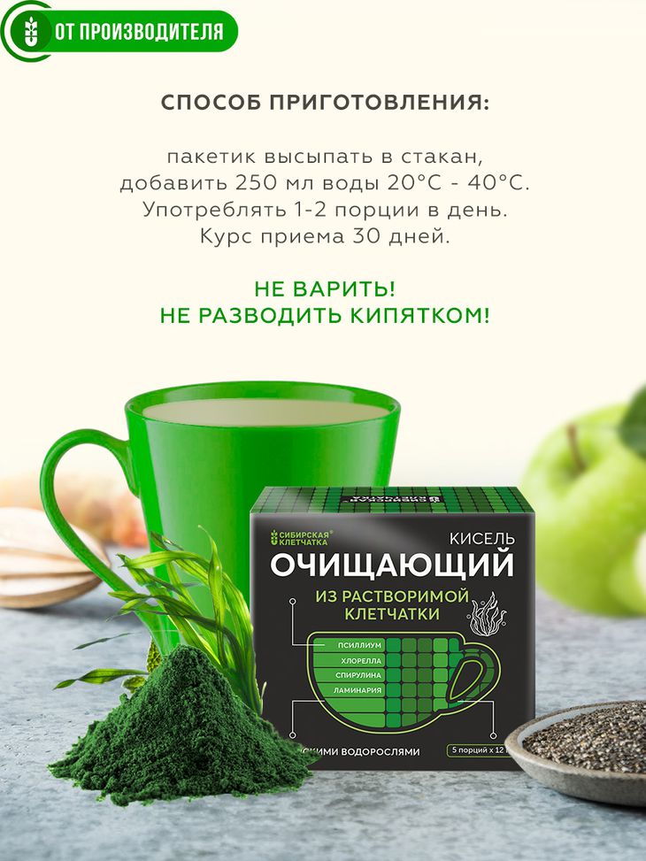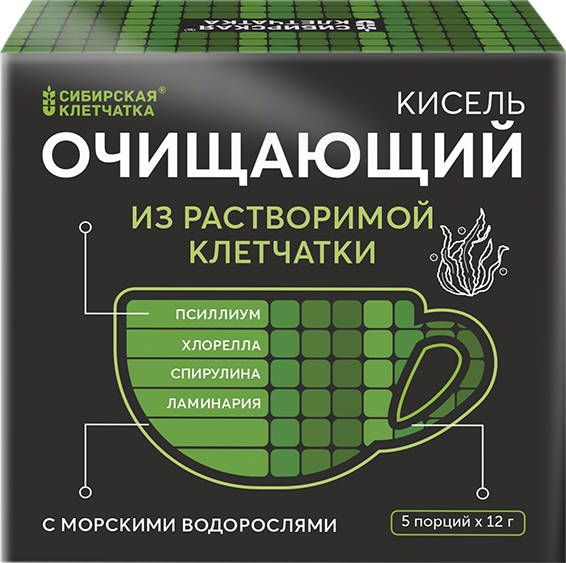 Оздоровительный кисель из растворимой клетчатки и водорослей, которая способствует связыванию и выводу токсинов и тяжёлых металлов.