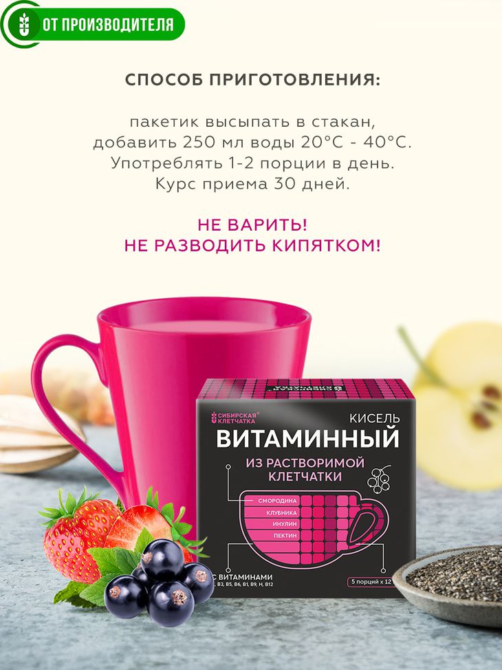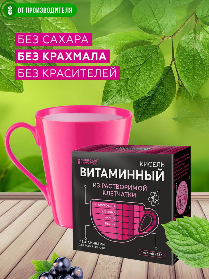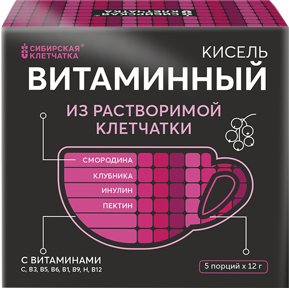 Кисель «Витаминный» общеукрепляющий из растворимой клетчатки и ягод. Обогащен витаминами группы В. Растворимая клетчатка улучшает образование и усвоение биологически активных веществ в кишечнике.