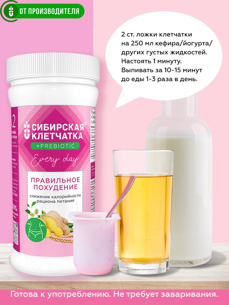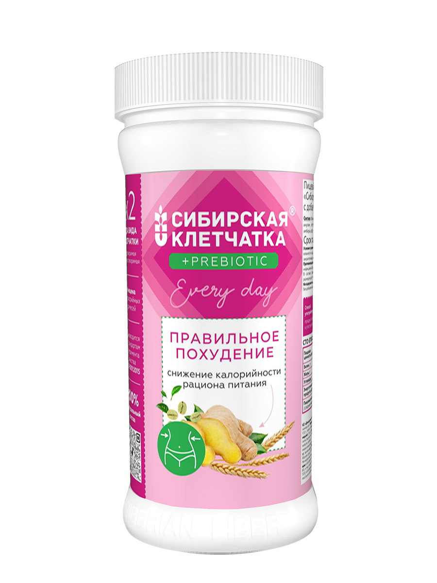 Плавное снижение и эффективное удержание оптимального веса с заботой о своём здоровье. Гармонично подобранный состав объединяет природные ингредиенты доказано уменьшающие избыточную жировую массу тела и разные виды клетчатки, снижающие калорийность ежедневного рациона питания. Впервые Сибирская клетчатка обогащена пребиотиками - растворимой клетчаткой необходимой для жизнедеятельности полезной микрофлоры кишечника. Уникальная технология изготовления продукта, разработанная и запатентованная в нашей компании сохраняет и усиливает полезное действие ценного растительного сырья. Активирует синергетический эффект компонентов состава.