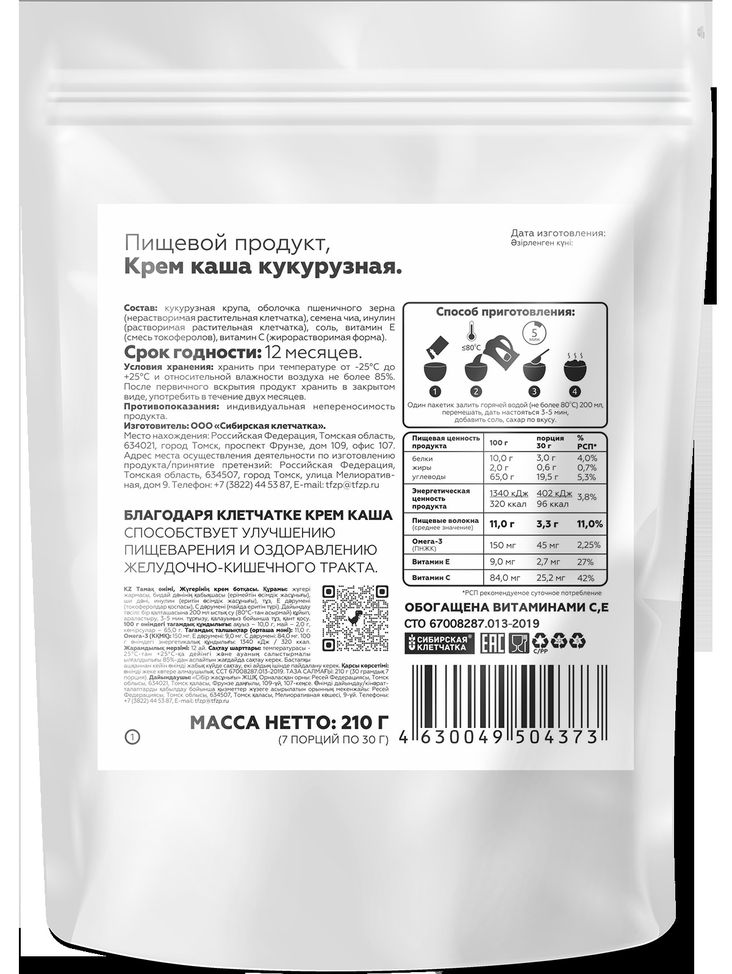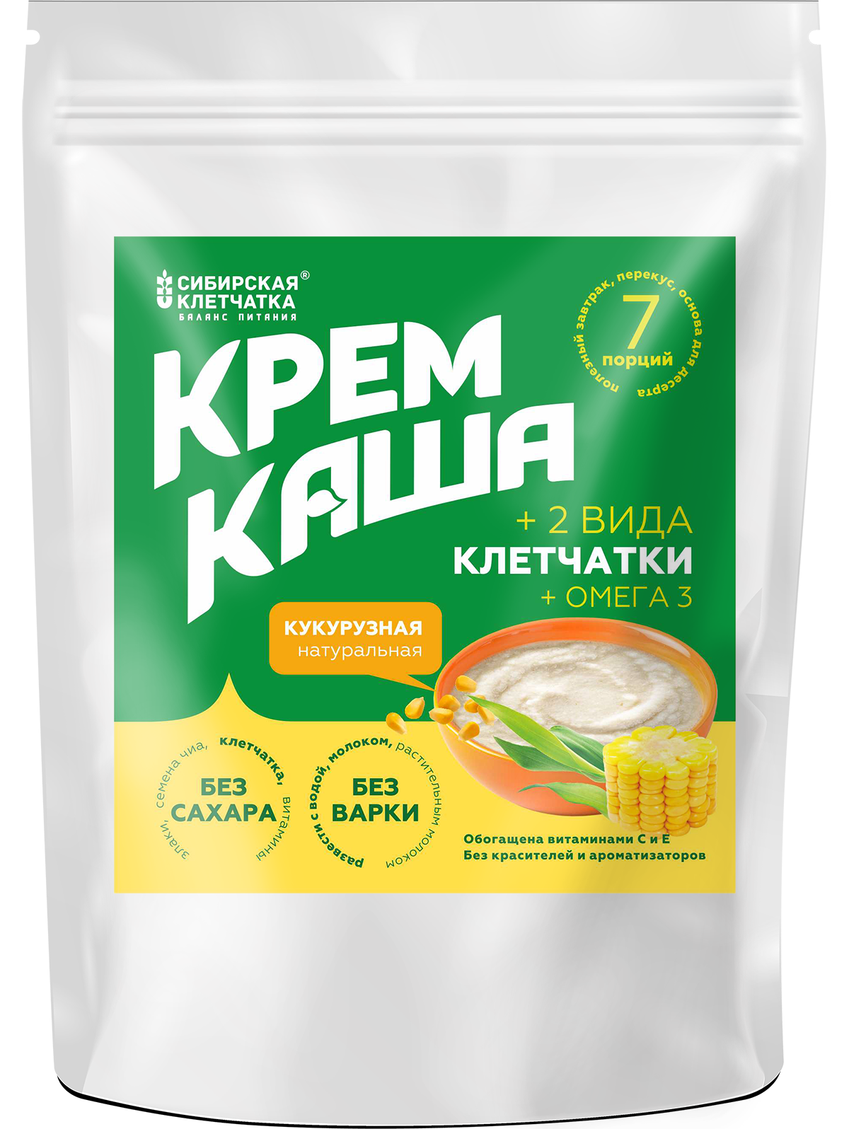 Кукурузная каша, которая облегчит жизнь хозяйкам дома. Горячее, вкусное и полезное питание для всей семьи. Готовится необыкновенно быстро. Легко подстраивается под разные вкусы и предпочтения. Крем каша от «Сибирской клетчатки» изготавливается с помощью технологий максимально сохраняющих пользу зёрен. Обогащается поддерживающей стройность клетчаткой и содержащими Омега-3 семенами Чиа в хорошо усвояемой форме. Вы легко приготовите, как густую, так и жидкую кашу. Которую дети всех возрастов любят пить из кружки и даже через трубочку. Каша отлично подходит для ежедневного сытного и полезного завтрака, перекуса на работе, диетического и спортивного питания.