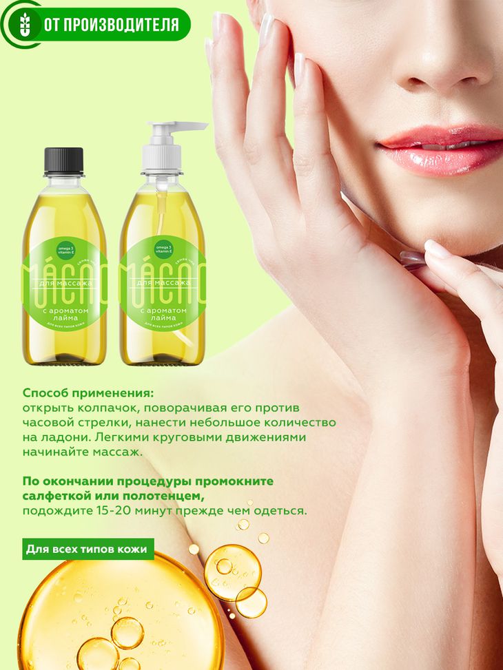 Масло для разных видов массажа: классический, оздоровительный, баночный, спортивный, гуаша, для лица.