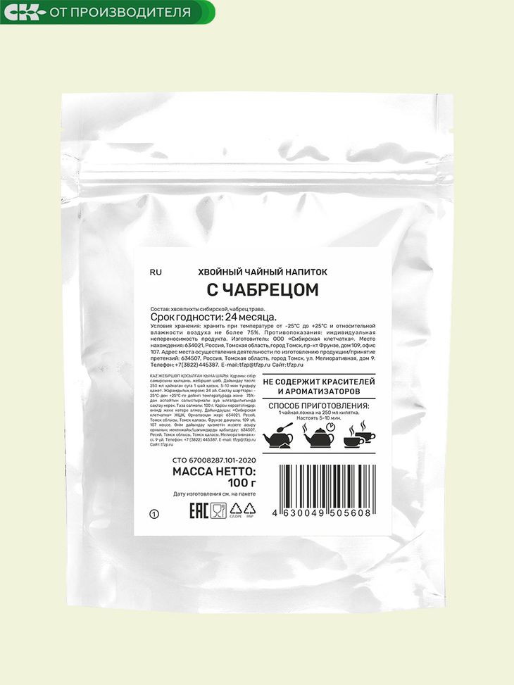Хвойный чай – это вкус и польза одновременно. Во время многоступенчатой подготовки чая мы освободили хвою пихты от смолистых веществ и сохранили богатый набор биоактивных соединений, присутствующих в свежей хвое таежного дерева. Оставили 100% пользы хвои пихты сибирской с добавления чабреца. Чай нужно залить водой 80-90% градусов, дать настояться пару минут и добавить по желанию мед, сахар или любой подсластитель. А можно и без других добавок наслаждаться вкусом самой природы. Приятного чаепития.