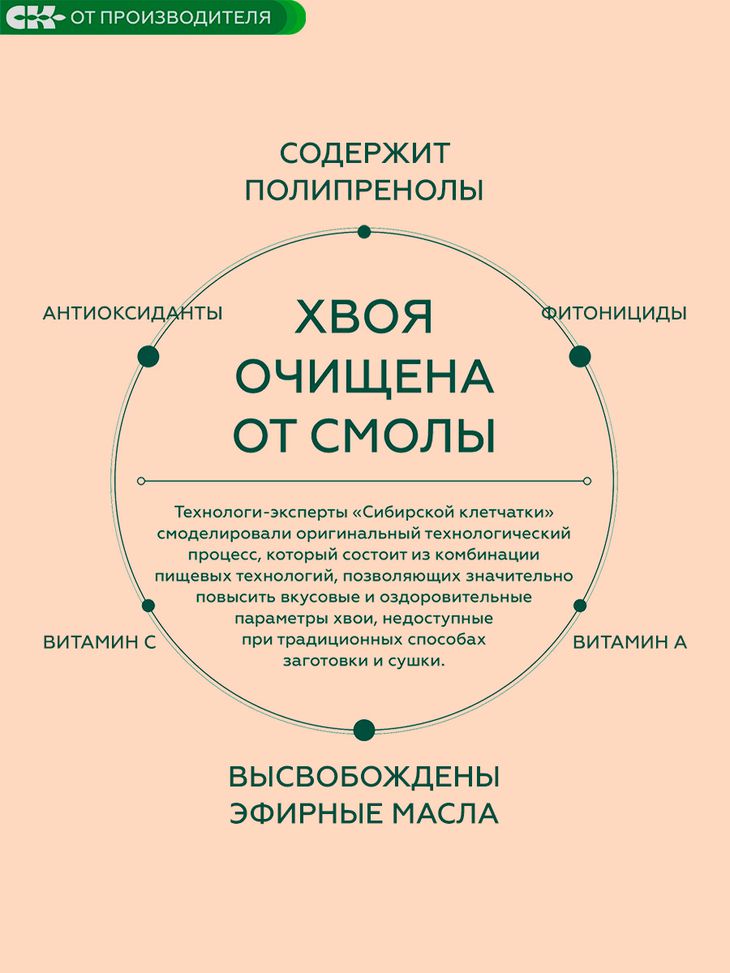 Хвойный чай – это вкус и польза одновременно. Во время многоступенчатой подготовки чая мы освободили хвою пихты от смолистых веществ и сохранили богатый набор биоактивных соединений, присутствующих в свежей хвое таежного дерева. Оставили 100% пользы хвои пихты сибирской с добавления Кусочками яблок, плоды шиповника измельченные, плоды можжевельника, кусочки имбиря, кусочки корицы, мята, плоды кардамона, перец душистый, гвоздика, кусочки малины.. Чай нужно залить водой 80-90% градусов, дать настояться пару минут и добавить по желанию мед, сахар или любой подсластитель. А можно и без других добавок наслаждаться вкусом
