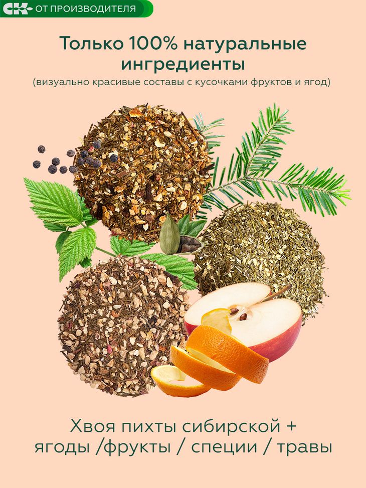 Интересный напиток с мягким хвойными нотами понравится всем мечтающим переместиться в недоступное спокойствие сибирской тайги. С сохранением тонкого аромата и вкуса хвои пихты и Кусочки яблок, плоды шиповника измельченные, плоды можжевельника, кусочки имбиря, кусочки корицы, мята, плоды кардамона, перец душистый, гвоздика, кусочки малины.