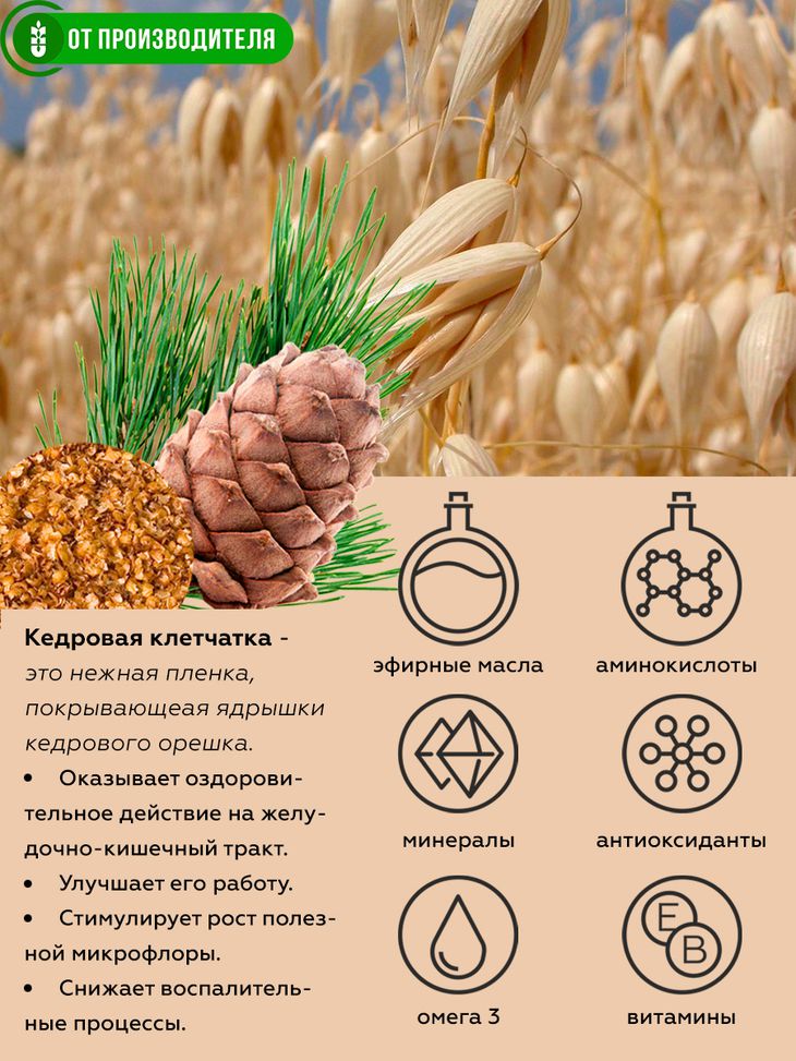 Нежная, золотистая пленка, покрывающая ядра орехов, источник ценной Кедровой клетчатки - настоящая таежная кладовая полезных веществ - витамина Е, флавоноидов, антиоксидантов, аминокислот, минералов и эфирных масел.