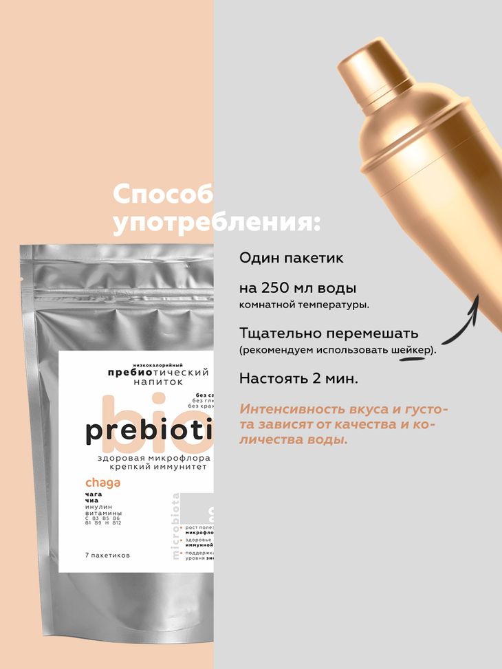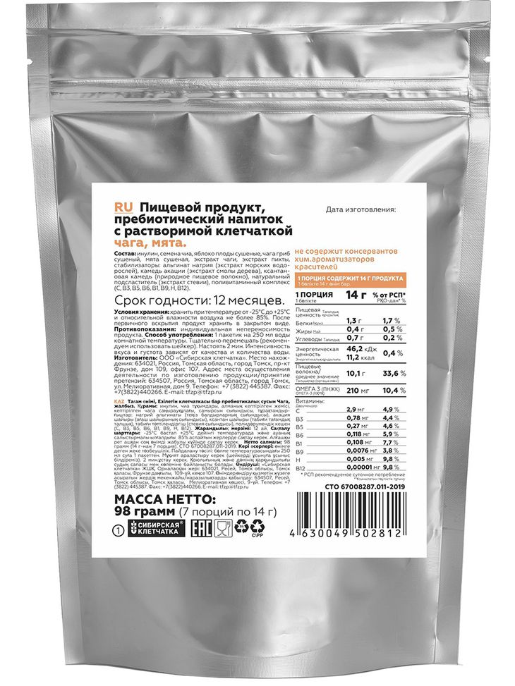 Пребиотический напиток с чагой и мятой. Рекомендуется для оздоровления и улучшения работы желудочно- кишечного тракта, восстановления сил, очищения организма, нормализации веса, поддержки полезной микрофлоры кишечника, укрепления иммунитета. Нежность, густота и обволакивающая консистенция напитка достигаются миксом из растворимой и вязкой клетчатки семян чиа, инулина, экстракта бурых водорослей. Ценителей здорового питания порадует состав напитка, в котором отсутствует сахар, ароматизаторы, красители и консерванты. Укрепляйте здоровье качественными, натуральными продуктами от компании Сибирская клетчатка!