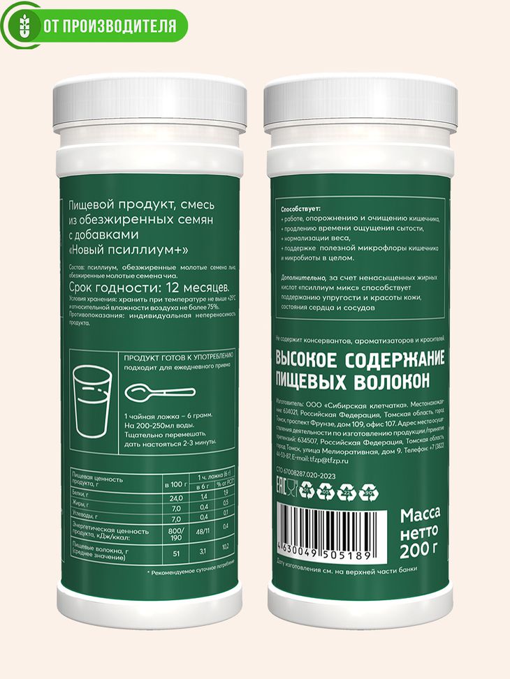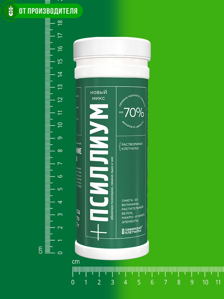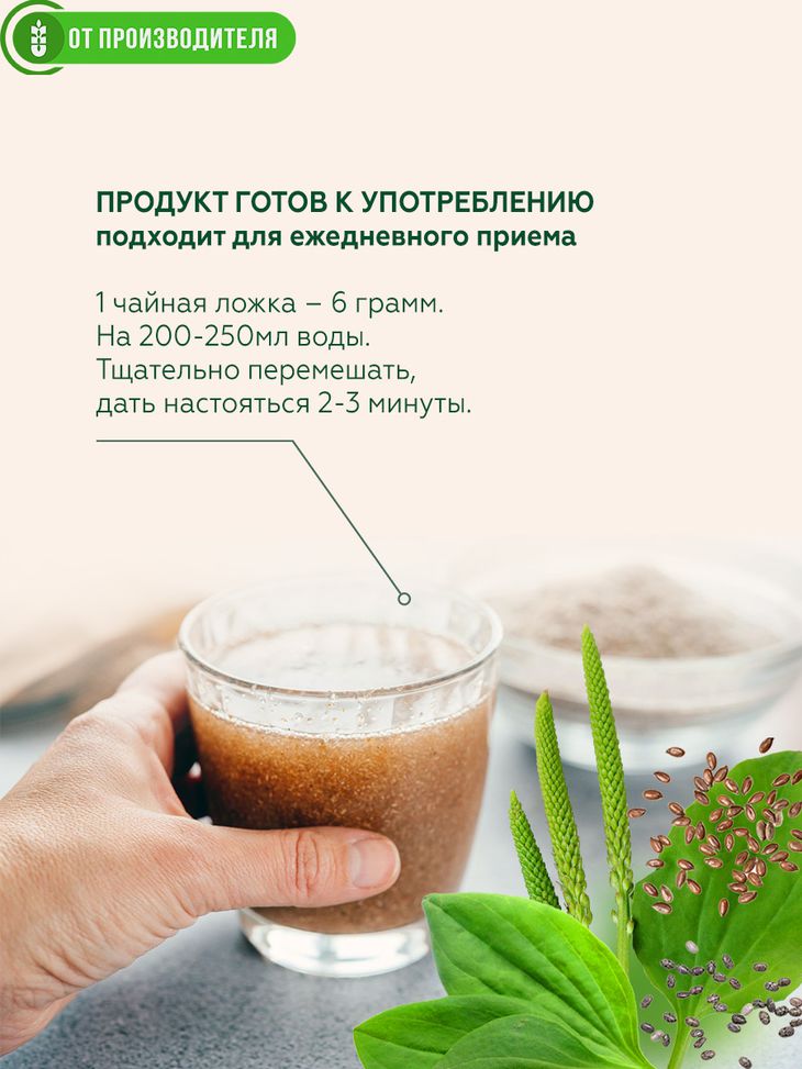 Мы создали «новый псиллиум» - растительный комплекс из псиллиума, семян льна и чиа, который по химическому составу и спектру полезного действия намного превосходит чистый псиллиум. Семена льна и семена чиа вошли в комплекс в измельченном и частично обезжиренном виде. Это позволяет повысить усвоение полезных веществ на 70% и не перегружает печень.