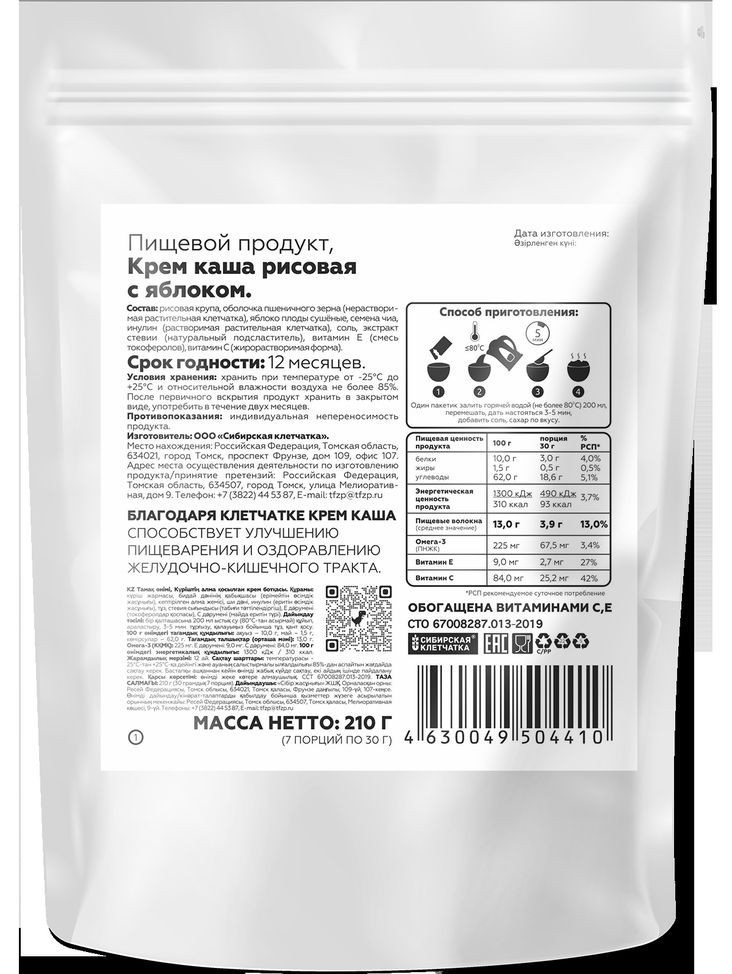 Рисовая каша, которая облегчит жизнь хозяйкам дома. Улучшит состояние суставов. Горячее, вкусное и полезное питание для всей семьи. Готовится необыкновенно быстро. Легко подстраивается под разные вкусы и предпочтения. Крем каша от «Сибирской клетчатки» изготавливается с помощью технологий максимально сохраняющих пользу зёрен. Обогащается натуральным яблоком и коллагеном. Регулярное употребление которого полезно для суставов, хрящей и связок. Вы легко приготовите, как густую, так и жидкую кашу. Которую дети всех возрастов любят пить из кружки. Каша отлично подходит для ежедневного сытного и полезного завтрака, диетического и спортивного питания.
