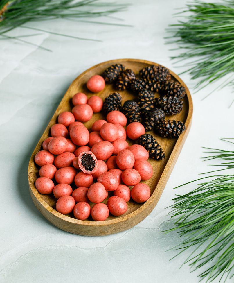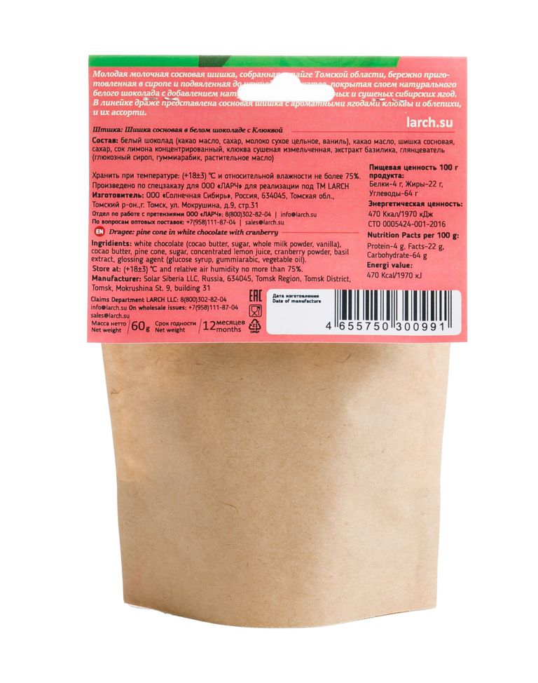 Молодая молочная сосновая шишка, собранная в тайге Томской области, бережно приготовленная в сиропе и подвяленная до нежнейших цукатов, покрытая слоем натурального белого шоколада с добавлением натуральных сублимированных и сушеных сибирских ягод. В линейке драже представлена сосновая шишка с ароматными ягодами клюквы и облепихи, и их ассорти.