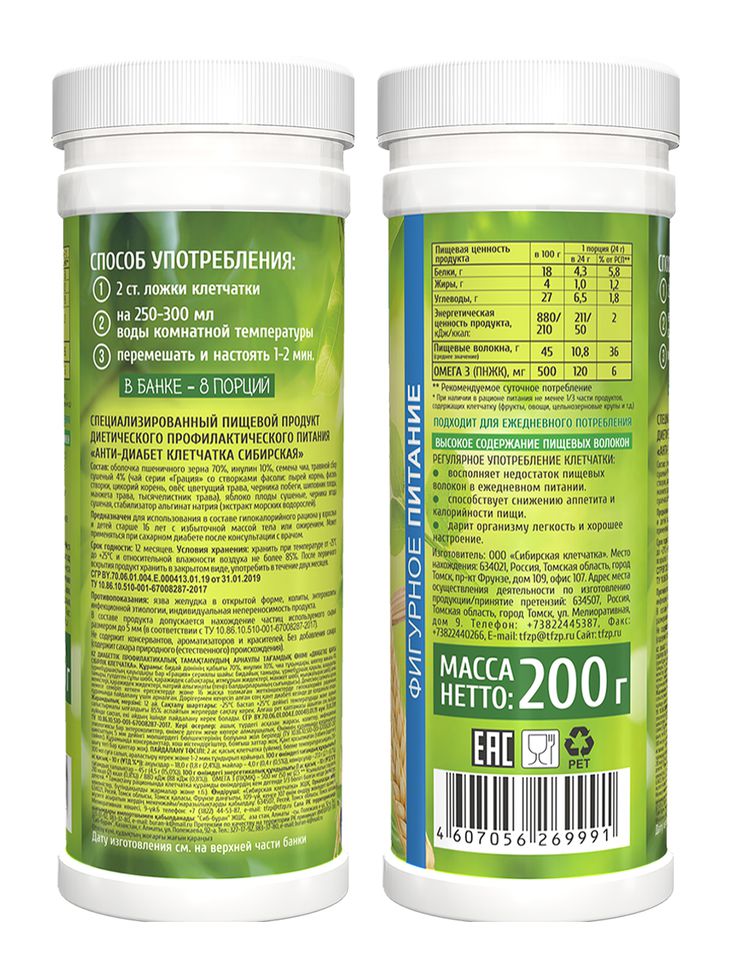 Продукт диетического/профилактического питания. Рекомендуется для облегчения симптомов и профилактики сахарного диабета. Сибирская клетчатка изготовлена по запатентованной технологии, повышающей биоактивные свойства ценного природного сырья. В продукте используется авторский сахарапонижающий сбор из 12 Сибирских и Алтайских трав. Новацией этой клетчатки является удобство приёма. Разведённая водой «форте» превращается в полезный коктейль, который легко пьётся и хорошо утоляет голод. Способ употребления: 1-2 ст. л. клетчатки размешать в стакане воды или другой жидкости, принимать 1-2 раза в день перед едой. Во время приёма клетчатки рекомендуется выпивать 1,5-2 л. воды в течение дня. Сибирская клетчатка - натуральные продукты для поддержания здоровья и активного долголетия.