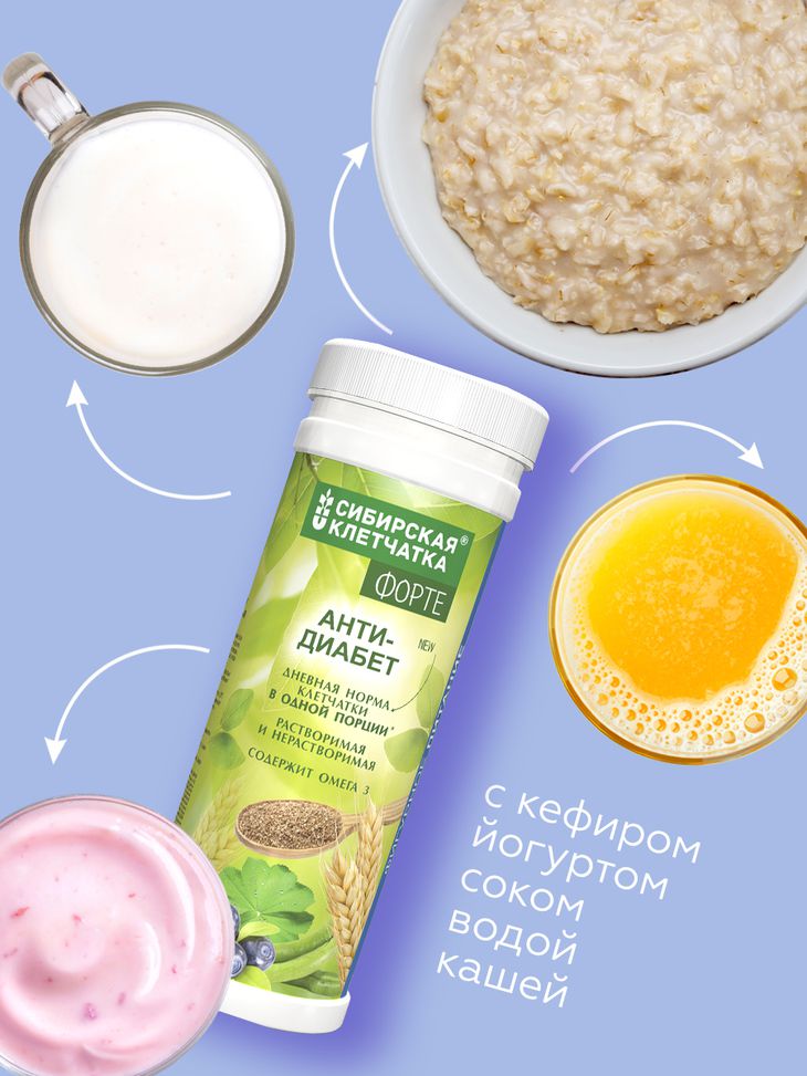 Снижаем сахар, улучшаем работу кишечника, нормализуем вес. 100% натуральный микс из сибирских трав, растворимой и не растворимой клетчатки. Сахаропонижающее действие сбора трав содержит побеги черники, створки фасоли и цикорий, усилено клетчаткой, которая доказано замедляет усвоение сахара и улучшает обмен веществ. Сибирская клетчатка "Анти-диабет" имеет свидетельство государственной регистрации как диетическое, профилактическое питание, рекомендованное для облегчения симптомов и профилактики сахарного диабета 1 и 2 типа. Клетчатка "Анти-диабет" - сухая многокомпонентная смесь для быстрого приготовления функционального коктейля.