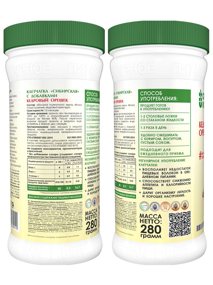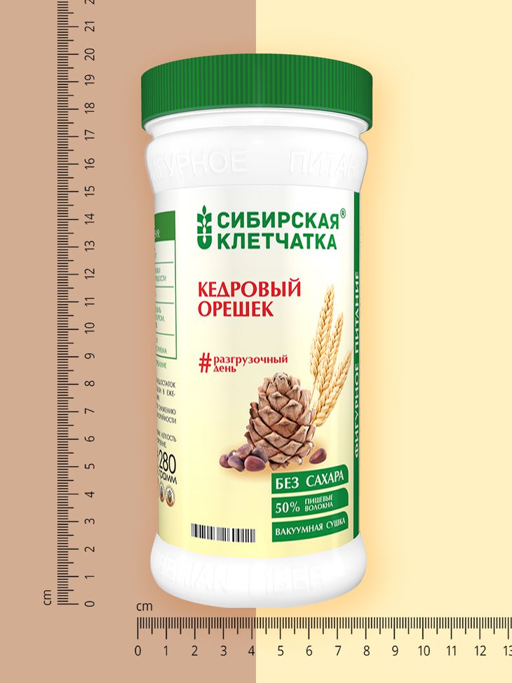 Сибирская клетчатка «кедровый орешек» содержит окружающую орешек и находящуюся под скорлупой оболочку дикорастущего кедрового ореха, содержащую природные антиоксиданты. Сибирская клетчатка - полностью натуральный продукт, без добавления сахара, химических ароматизаторов и консервантов.