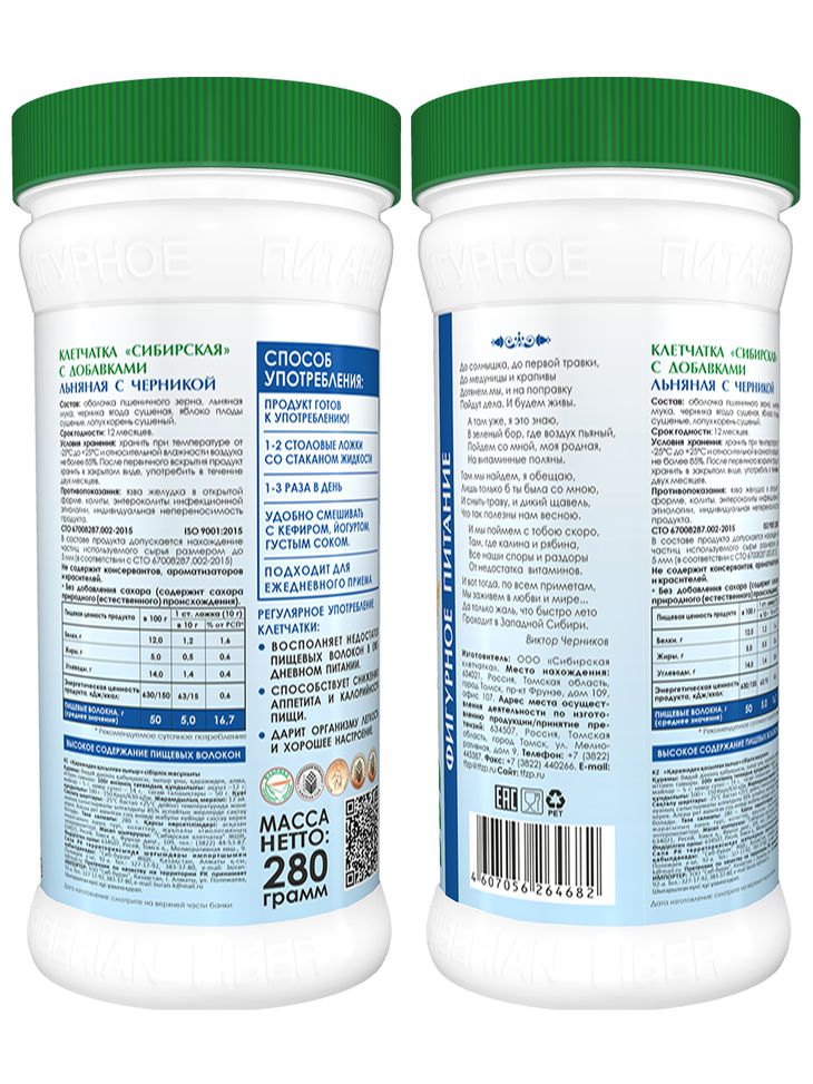 Сибирская клетчатка «Льняная с черникой» содержит лен, чернику, которая полезна для зрения, а также яблоко и корень лопуха.