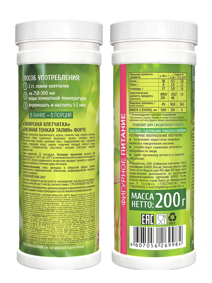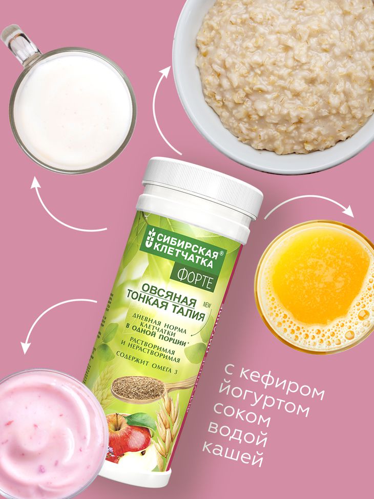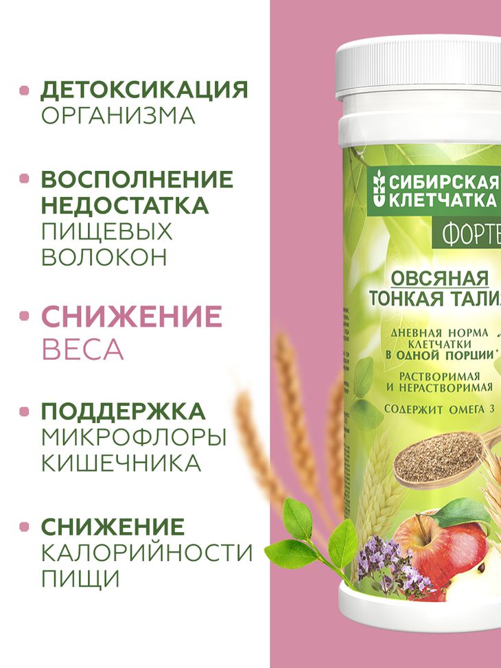 Раскроем "секрет" правильного похудения- утоление голода полезными продуктам с низкой калорийностью и высокой биологической ценностью. Клетчатка "Овсяная Тонкая талия" попадая в желудок разбухает, утоляя голод, а потом, продвигаясь по кишечнику, препятствует усвоению жиров и сахаров, одновременно очищая организм от токсинов и канцерогенов. Сибирские травы, входящие в состав, дополняют природный детокс эффект клетчатки. Семена Чиа, находящиеся в составе содержат ненасыщенные жирные кислоты, среди которых преобладает -Омега-3 комплекс полезный для сердечно-сосудистой системы. Клетчатка "ФОРТЕ"- сухая многокомпонентная смесь натуральных продуктов для быстрого и легкого приготовления похудательного коктейля.