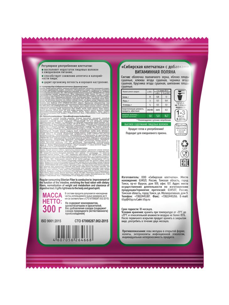 Перед Вами полезный продукт, в составе которого объединены клетчатка и ценные таежные дикоросы. Издавна бруснику, клюкву и чернику используют для профилактики болезней и укрепления здоровья. Клюкву и бруснику применяют при лечении гипо- и авитаминозов. Черника дает силы, способствует улучшению зрения. Шиповник — источник витамина С. Сочетание целебных свойств клетчатки и сибирских дикоросов благотворно влияет на обмен веществ и сопротивляемость болезням.