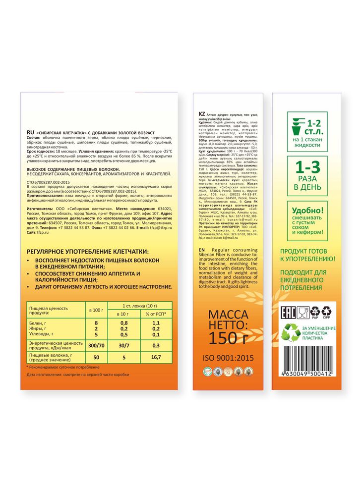 Специальная клетчатка для поддержания здоровья, профилактики болезней и активного долголетия людей. Имеет богатейший состав — набор необходимых витаминов и минералов для мужчин и женщин прекрасного золотого возраста.