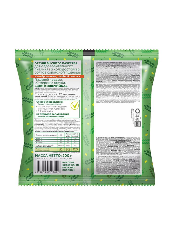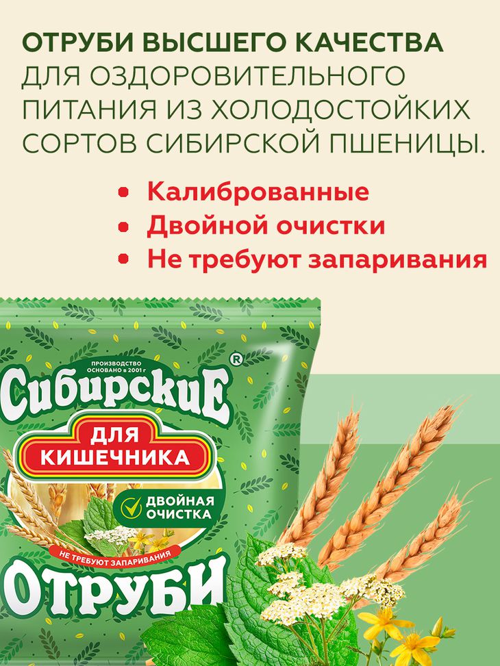 Отруби Сибирские "для Кишечника". Рекомендуются как профилактическое и оздоровительное средство, необходимое для полноценной работы кишечника, снижения холестерина в крови, очистки пищеварительного тракта от шлаков и токсинов.