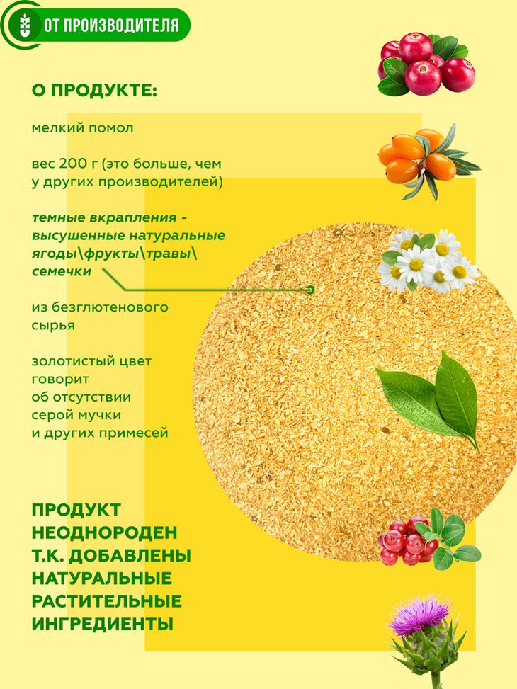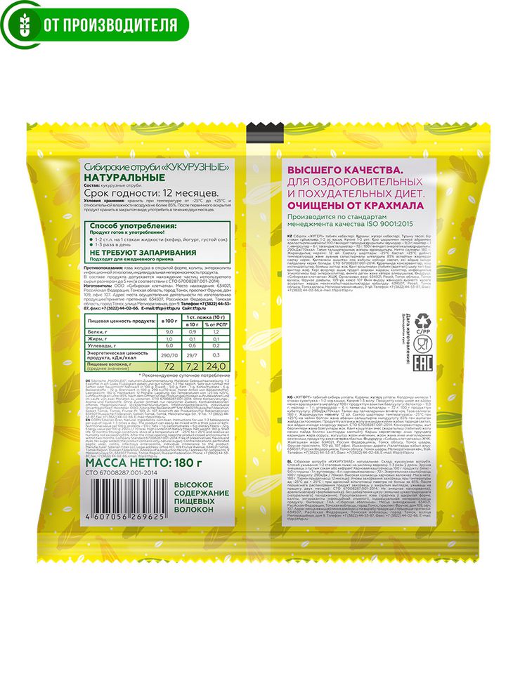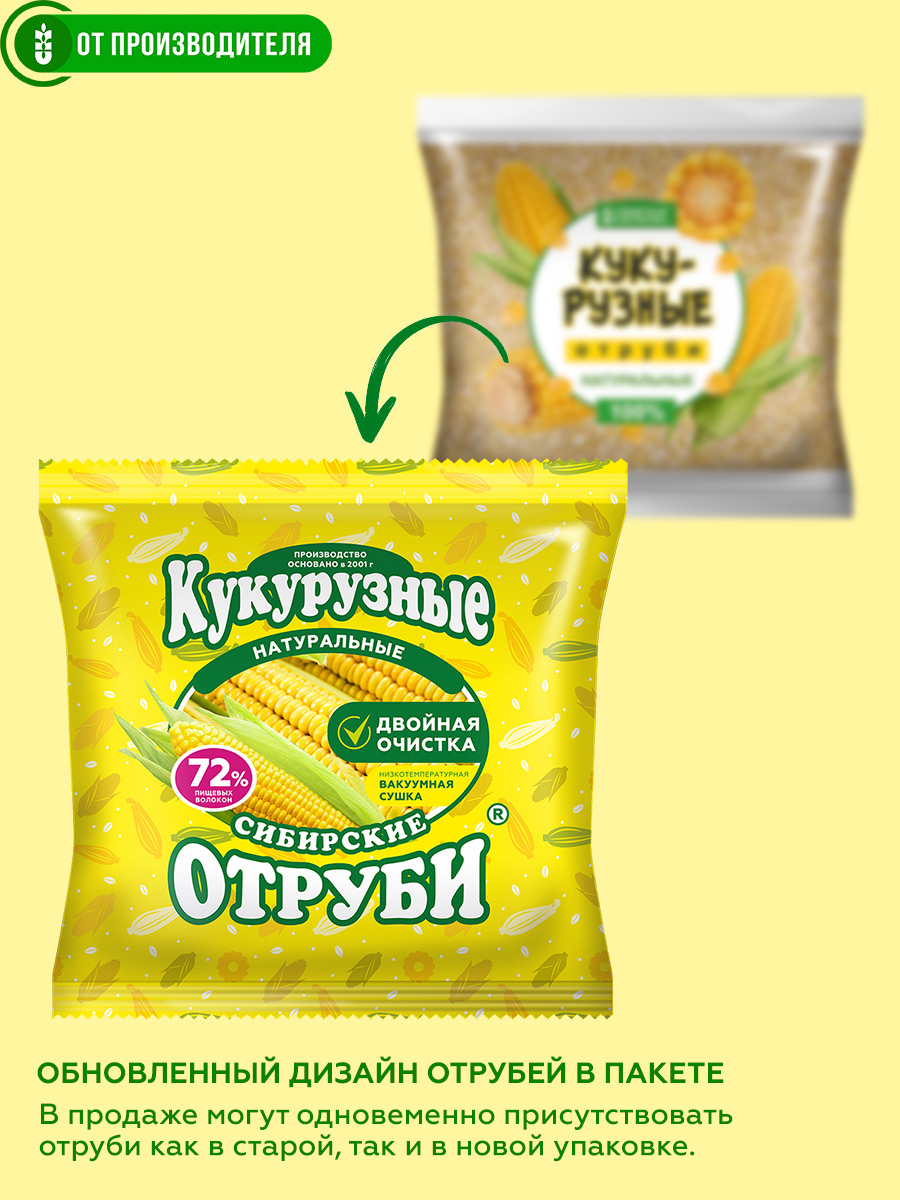 Естественное очищающее действие клетчатки, в избытке содержащейся в кукурузных отрубях, мы усилили действием Сибирских трав пропитав их настоем каждую частичку отрубей. Для этого мы применили технологию вакуумного экстрагирования сохраняющую пользу натуральных ингредиентов.