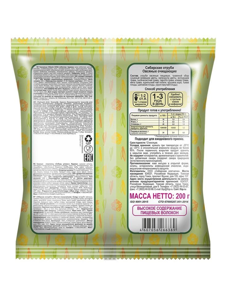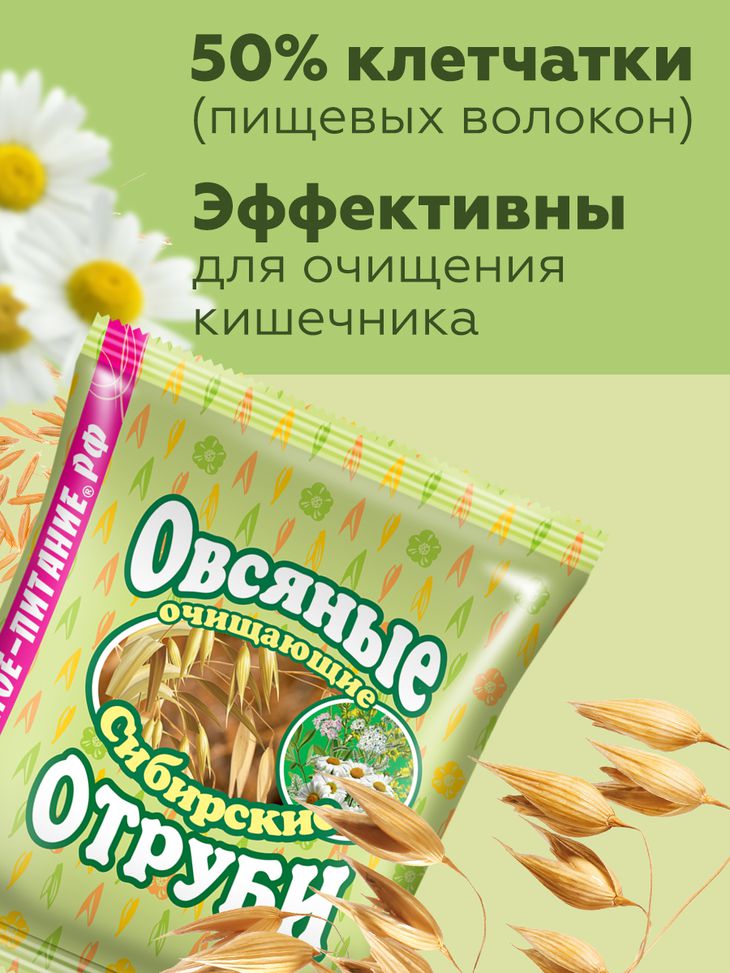 Золотой стандарт овсяных отрубей с дикорастущими Сибирскими травами. Мы готовим «Очищающие отруби», используя уникальную технологию, активирующую полезные свойства и биодоступность отрубей и 9 трав. Отруби прошли двойной просев и вакуумную сушку, что значительно увеличило качество и на 15% снизило количество не нужных, калорийных примесей. Отруби «Сибирские овсяные очищающие» получают из местных, холодостойких сортов овса, накапливающих больше полезных веществ, чем их «южные родственники». Регулярное употребление овсяных отрубей: улучшает работу кишечника, помогает его регулярному опорожнению, обогащает рацион растительными волокнами, в том числе бета-глюканами, укрепляющими иммунитет. Способствует удержанию и снижению веса. Добавляйте в рацион питания овсяные отруби, дарите организму лёгкость и хорошее настроение! Ежедневный приём от 2х до 6 столовых ложек.