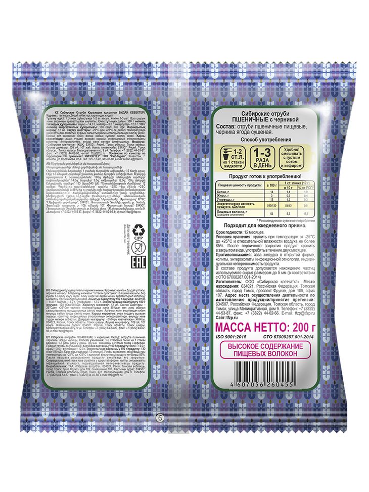Отруби Сибирские с черникой. Имеют оптимальный размер частиц для комфортного приёма. Проходят двойной просев от посторонних примесей и 98% очистку от муки.