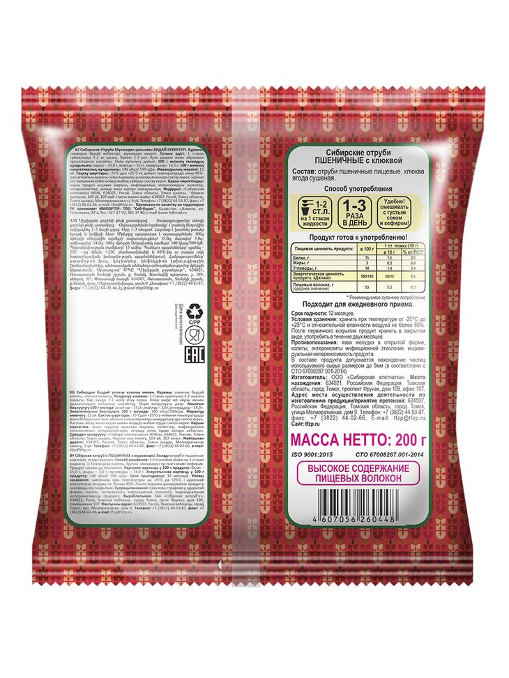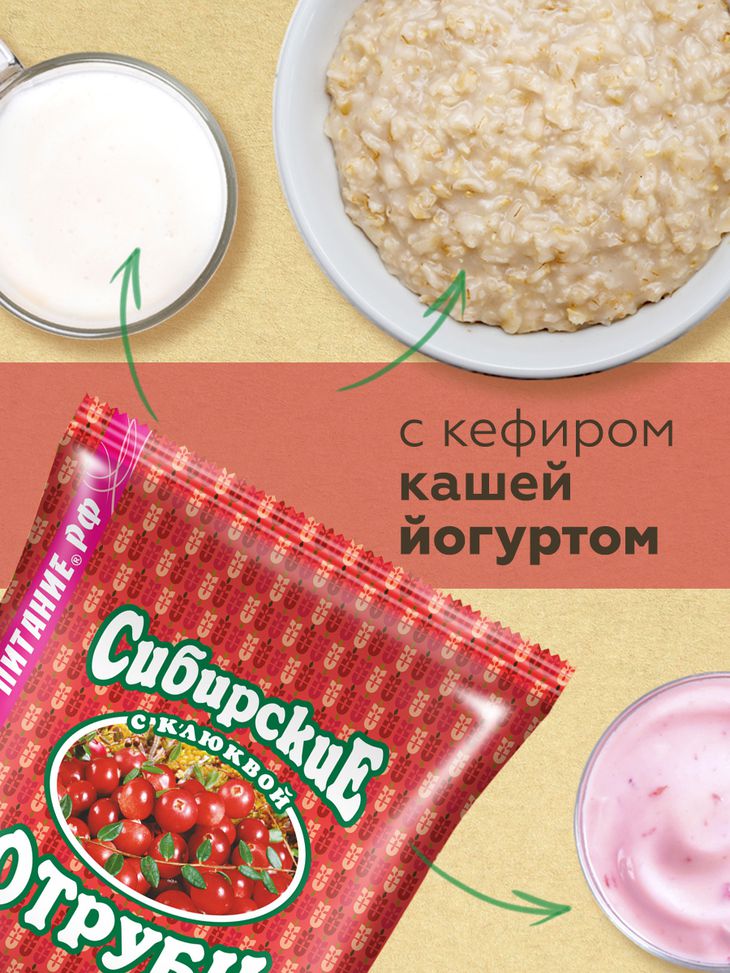 Отруби Сибирские с клюквой. Имеют оптимальный размер частиц для комфортного приёма. Проходят двойной просев от посторонних примесей и 98% очистку от муки.