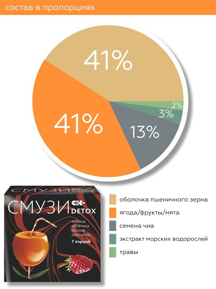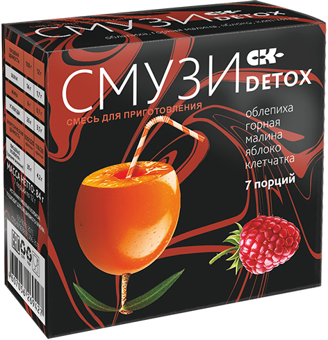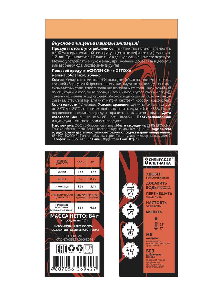 Уникальная формула детокс эффекта это три вида клетчатки, усиленные Сибирскими травами, малиной, облепихой и яблоком. Первый, натуральный смузи в виде сухой основы для приготовления детокс коктейля. Семена Чиа обогащают смузи Омега-3, ягода - витаминами, а клетчатка - главный очищающий компонент. Полностью натуральный, без добавления ароматизаторов, сахаров и консервантов. Смузи расфасован в 7 порционных пакетов. Для раскрытия вкуса ягоды при разведении в воде настоять 5 мин. При разведении в кисломолочных напитках, растительном молоке 20 мин. По желанию добавить в смузи мёд, сахар.