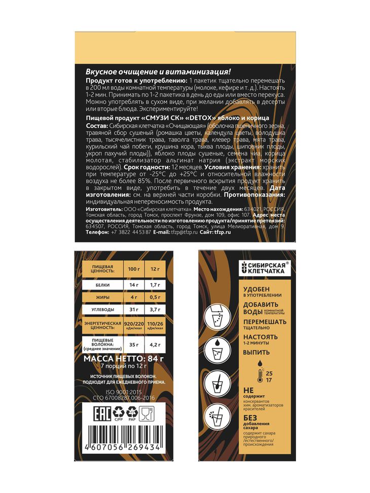 Уникальная формула детокс эффекта это три вида клетчатки, усиленные Сибирскими травами, яблоком и корицей. Первый, натуральный смузи в виде сухой основы для приготовления детокс коктейля. Семена Чиа обогащают смузи Омега-3, ягода - витаминами, а клетчатка - главный очищающий компонент. Полностью натуральный, без добавления ароматизаторов, сахаров и консервантов. Смузи расфасован в 7 порционных пакетов. Для раскрытия вкуса ягоды при разведении в воде настоять 5 мин. При разведении в кисломолочных напитках, растительном молоке 20 мин. По желанию добавить в смузи мёд, сахар.