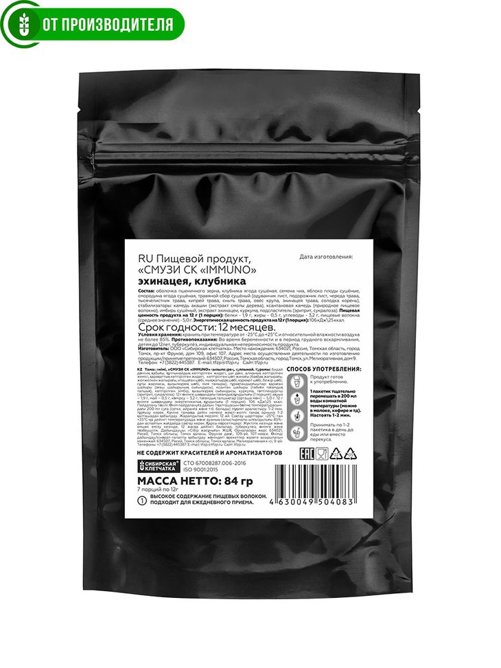 Содержимое пакетика подходит, как для приготовления иммунно укрепляющего смузи, так и для добавления в другие виды смузи и функциональные напитки для повышения их пользы.
