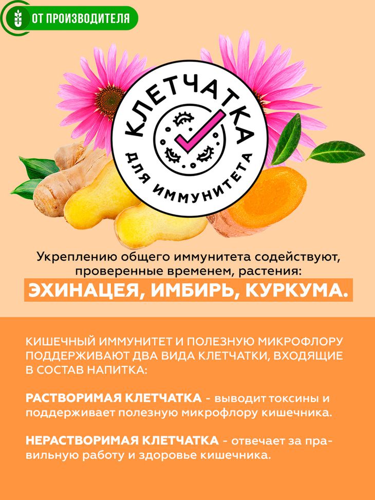 Укреплению общего иммунитета содействуют, проверенные временем, растения: эхинацея, имбирь, куркума. Кишечный иммунитет и полезную микрофлору поддерживают два вида клетчатки входящие в состав напитка.