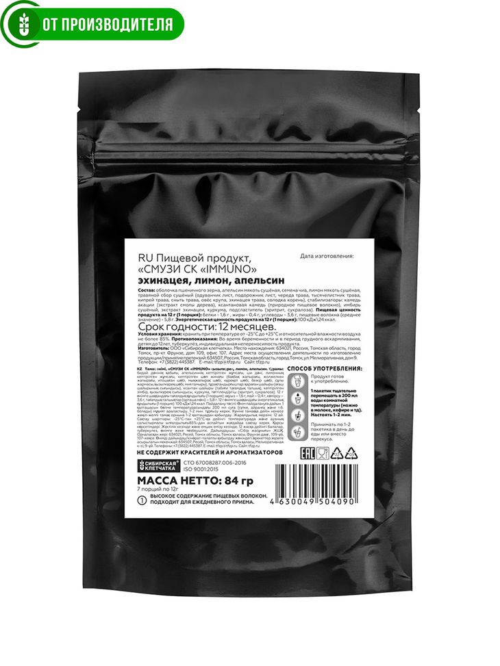 Содержимое пакетика подходит, как для приготовления иммунно укрепляющего смузи, так и для добавления в другие виды смузи и функциональные напитки для повышения их пользы.